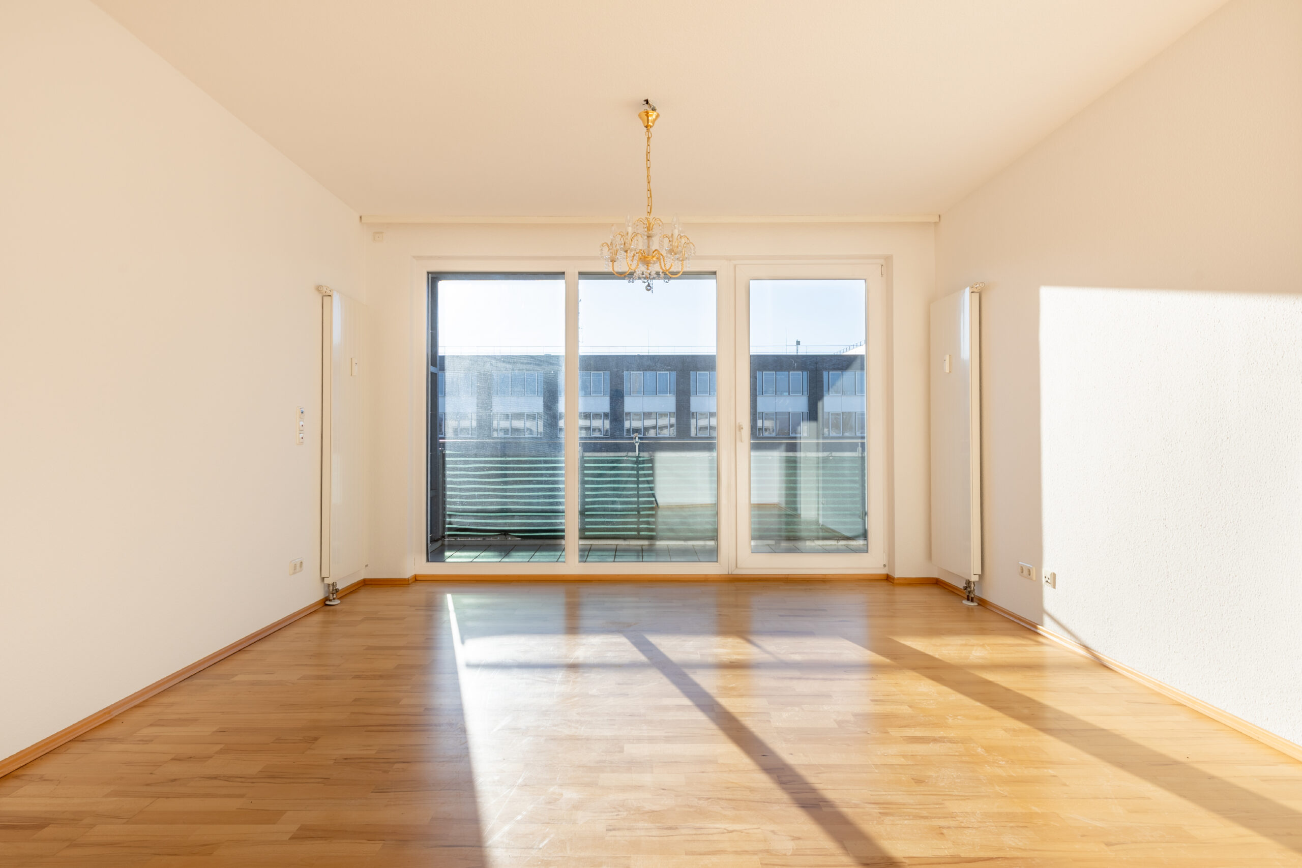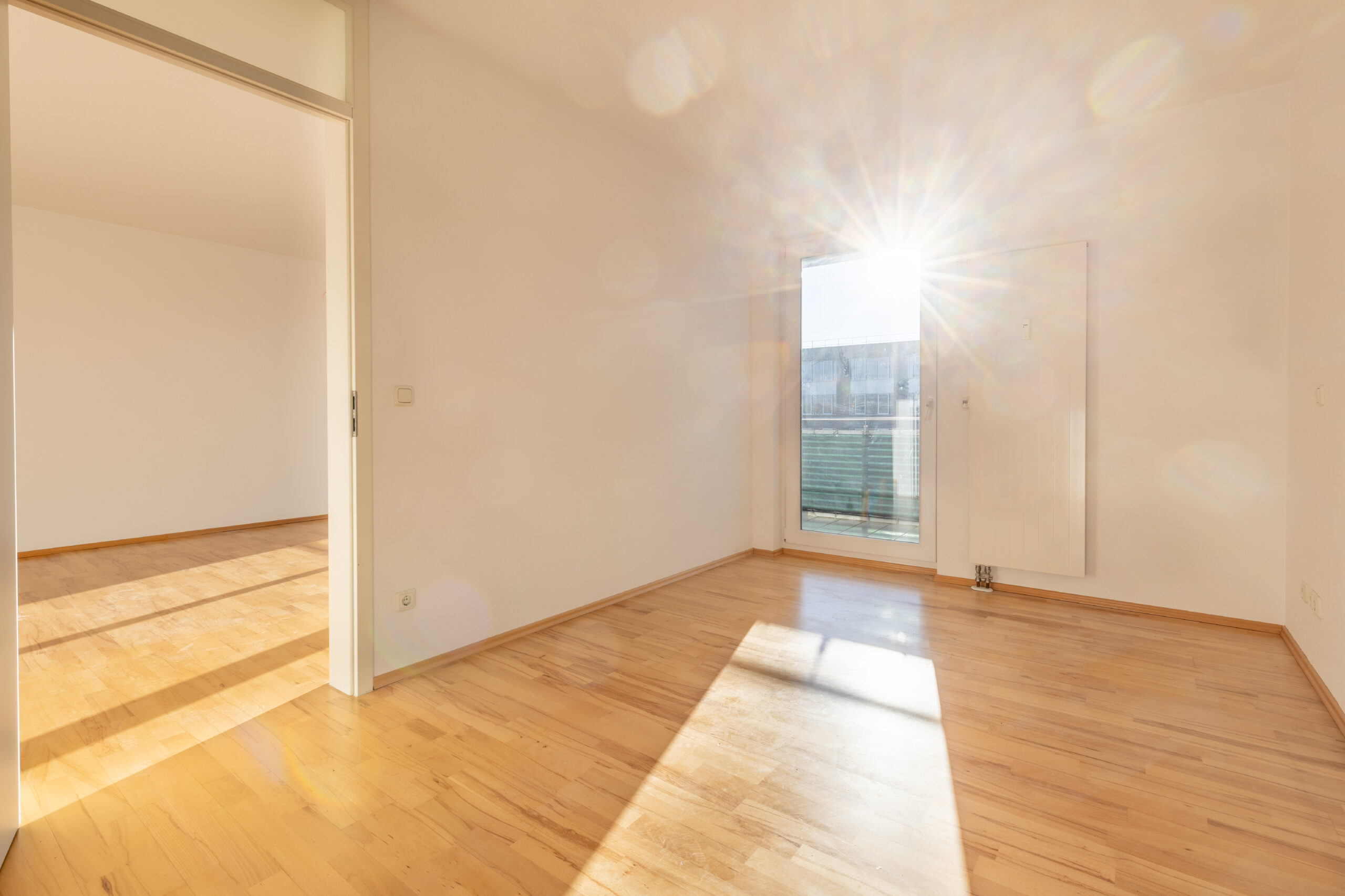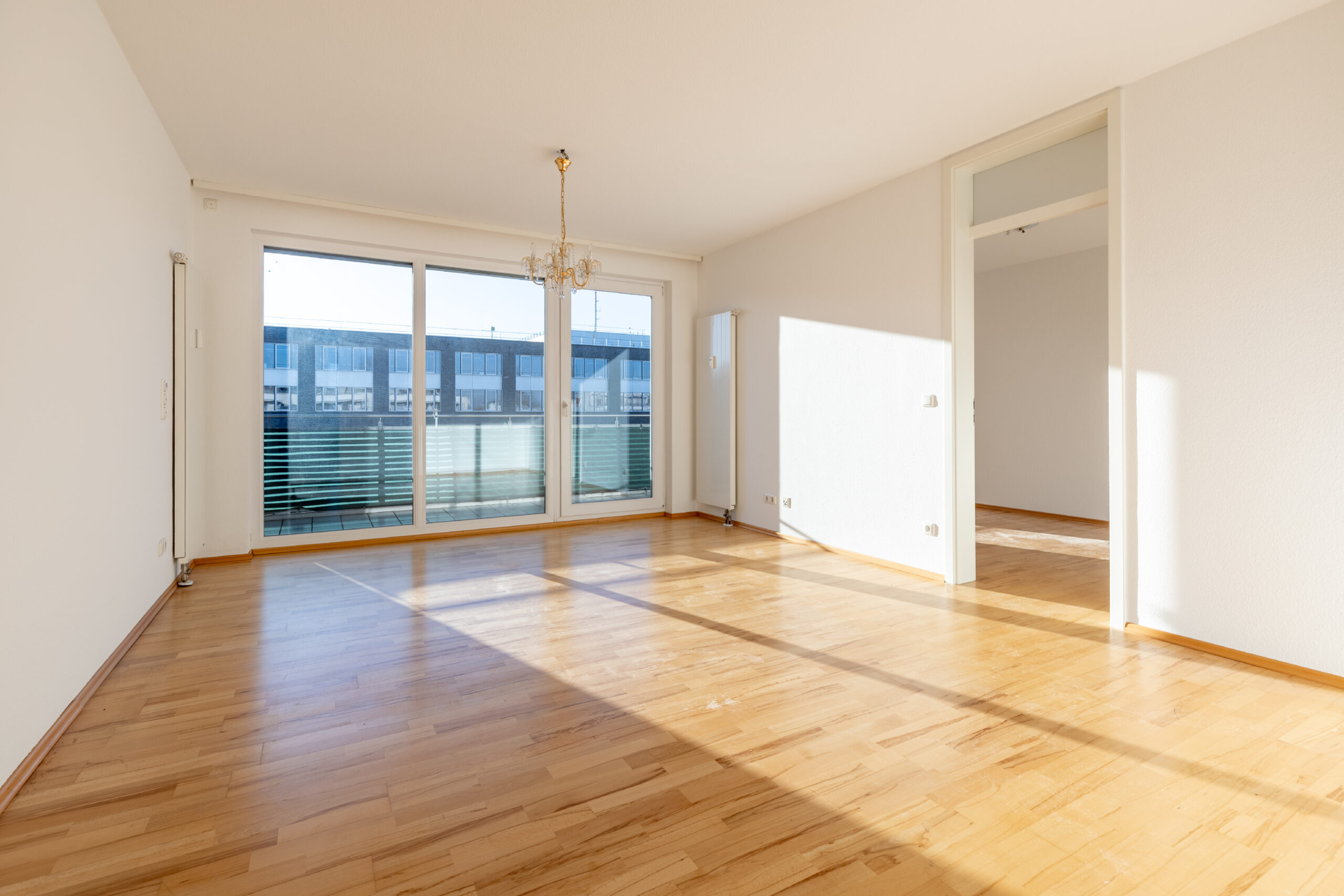 Der Eingangsbereich ist eine zentrale Diele mit praktischen Einbauschränken. Der Wohnbereich ist großzügig geschnitten und bildet den Mittelpunkt der Wohnung. Vom Wohnzimmer aus ist ein weiteres Zimmer direkt begehbar. Beide Räume verfügen über einen Zugang zum großen, nach Süden ausgerichteten Balkon, der zusätzlichen Freiraum im Außenbereich bietet.