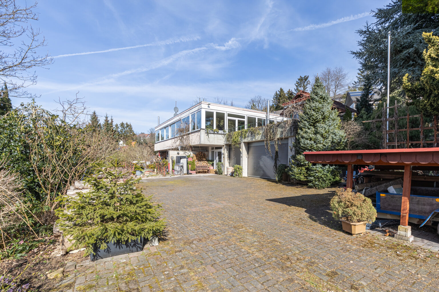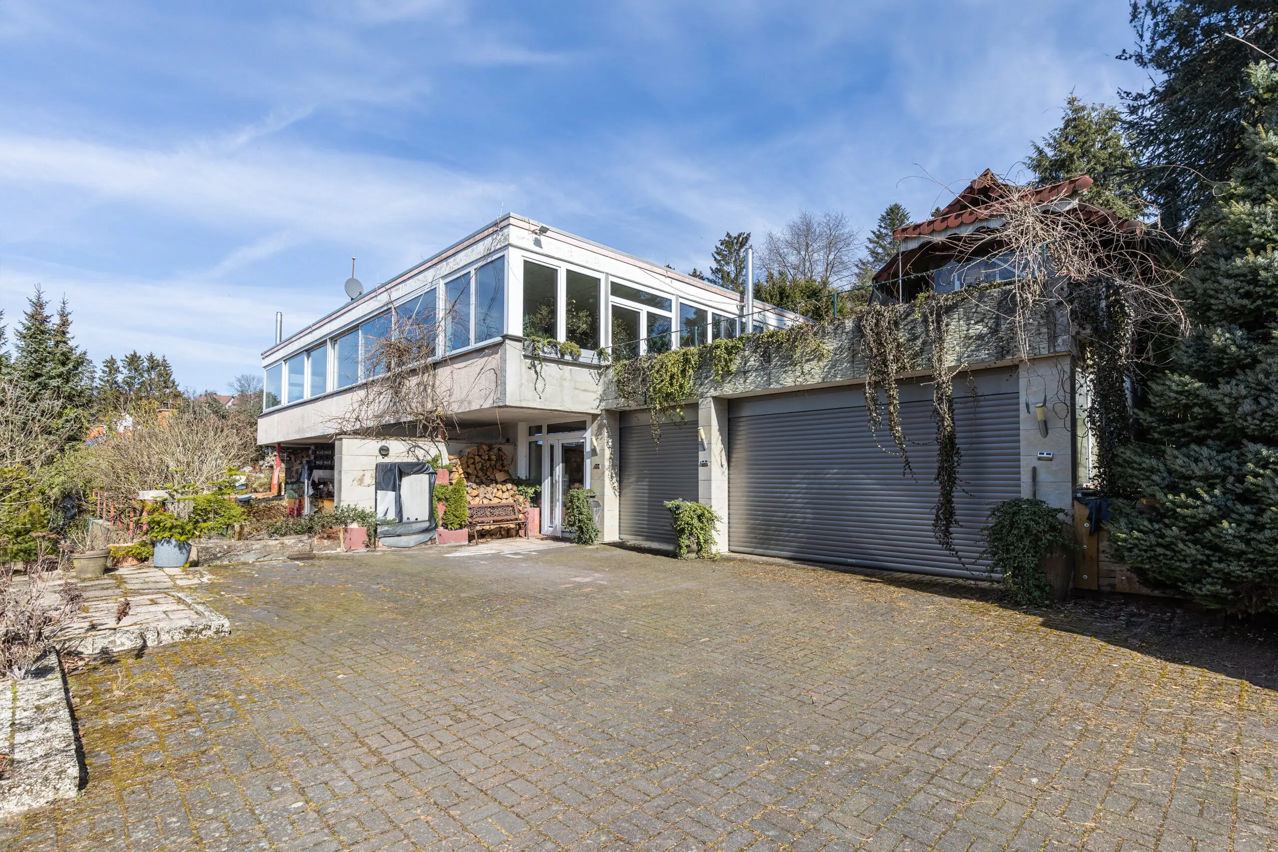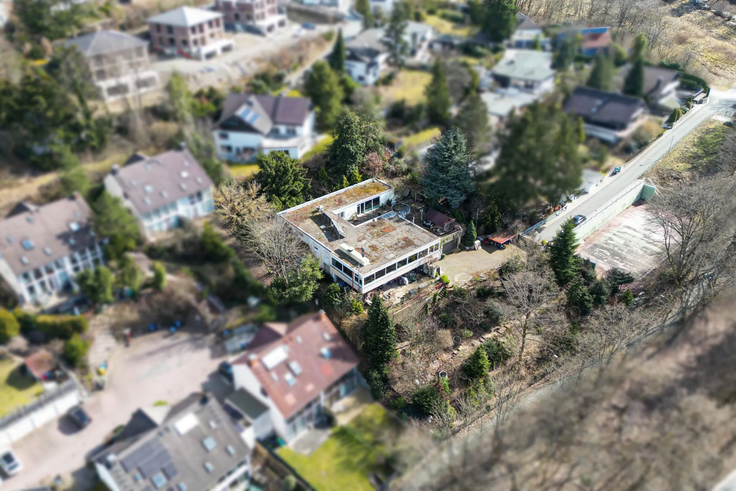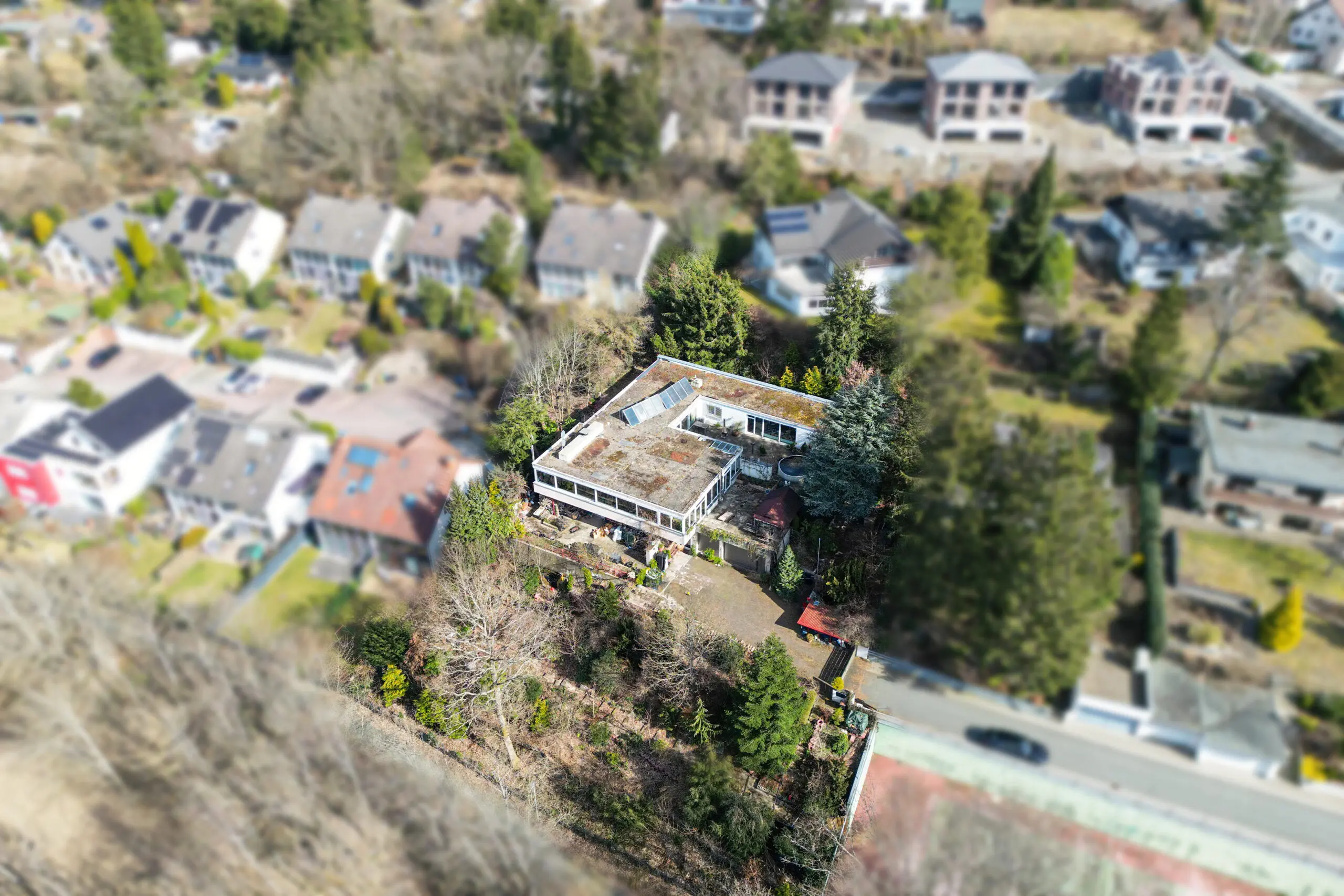 Sie erwartet hier eine beeindruckende und ehemalige Unternehmervilla, die als Flachdach-Bungalow in U-Form erbaut wurde und mit ca. 408 m² Wohnfläche sowie zusätzlichen ca. 207 m² Nutzfläche ein außergewöhnliches Raumangebot bietet. Das Anwesen befindet sich auf einem großzügigen Grundstück, das aus zwei Flurstücken besteht und durch seine Hanglage einen naturbelassenen Garten sowie mehrere Terrassen umfasst.